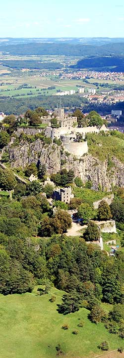 Noch heute zeugen die Gebäude und Reste der Verteidigungsanlagen von ihrer einstigen Bedeutung und bewegten Geschichte. Der Aufstieg auf den Hohentwiel wird mit einem atemberaubenden Ausblick bis hin zum Bodensee und den Gipfeln der Alpen belohnt.